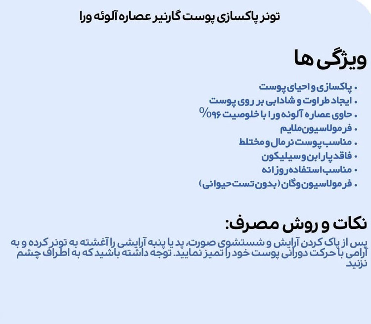 تونر بوتانیکال آلوئه ورا گارنیر حاوی اسید سالیسیلیک می باشد که در پاکسازی منافذ و پیشگیری از بروز کمدون و جوش ها سر سیاه و سر سفید موثر است. همچنین تونر بوتانیکال آلوئه ورا گارنیر علاوه بر پاکسازی عمیق پوست به شفافیت و نرمی پوست نیز کمک می کند و برای پوست های نرمال و مختلط مناسب می باشد.